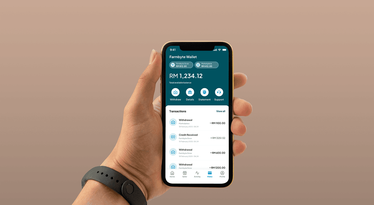 Designing the FarmByte Credit Wallet feature to help users track all income from the FarmByte marketplace, providing clear visibility of earnings, organized transaction history, and a seamless way to manage financial activities.